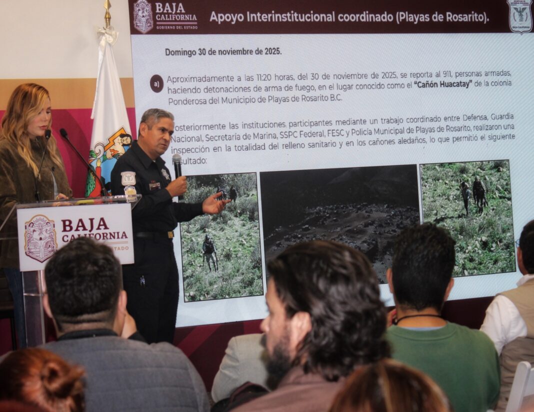 De acuerdo con la información oficial, a las 11:20 horas del domingo 30 de noviembre se reportó al 9-1-1, la presencia de personas armadas realizando detonaciones de arma de fuego en el “Cañón Huacatay” de la colonia Ponderosa, en Rosarito, por lo que al lugar acudieron agentes de la Policía Municipal de Rosarito, Fuerza Estatal de Seguridad Ciudadana (FESC), Secretaría de Marina (SEMAR), Guardia Nacional (GN), y de la Secretaría de Seguridad y Protección Ciudadana (SSPC) Federal, quienes inspeccionaron el relleno sanitario y los cañones aledaños.