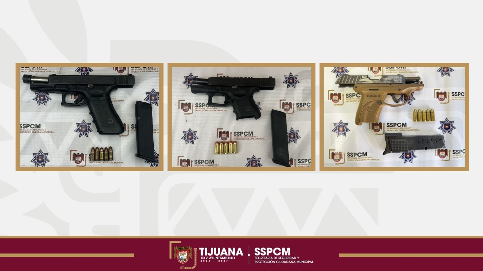 La aprehensión ocurrió en la intersección del bulevar García y Palma Real de los Valles, en inmediaciones del fraccionamiento Natura, en el sureste de Tijuana, cuando los sujetos arrojaron al suelo las pistolas e intentaron huir corriendo al notar la presencia policial.