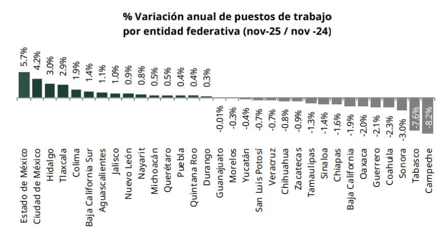 El Estado de México y la Ciudad de México fueron las entidades donde la creación de empleo tuvo un mayor avance, con 5.7% y 4.2%, respectivamente.