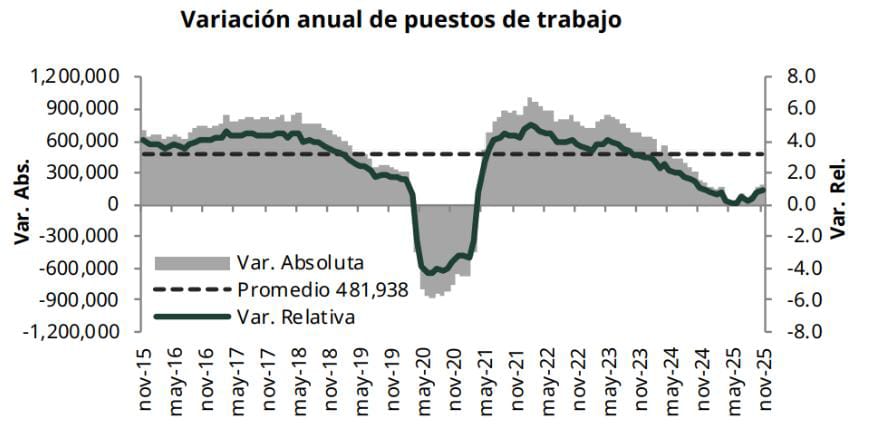 Según el Instituto Mexicano del Seguro Social (IMSS), en el acumulado enero – noviembre se crearon 599 mil 389 puestos formales, lo que representó un alza de 2.7% respecto al mismo periodo de 2024.