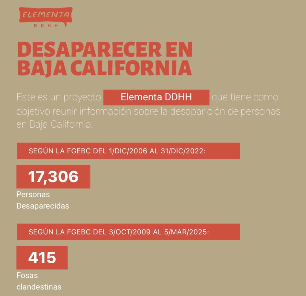 De acuerdo con los datos presentados por Elementa DDHH, existían 17 mil 306 personas desaparecidas en Baja California desde el 2006 al 2022, cifras que siguen sin poder ser actualizadas por la falta de transparencia de la fiscalía.