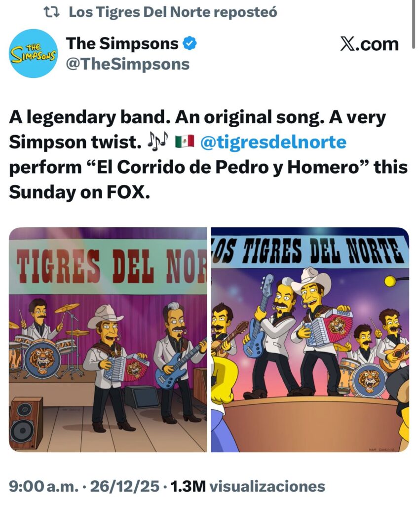 “Una banda legendaria. Una canción original. Un toque muy Simpson. Los Tigres del Norte presentarán El Corrido de Pedro y Homero este domingo en FOX”, se lee en el anuncio.
