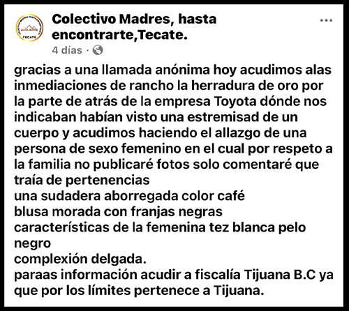 Una llamada anónima activó nuevamente a las integrantes del colectivo de búsqueda de personas desaparecidas “Madres Hasta Encontrarte Tecate”, el viernes 28 de noviembre del 2025, quienes apenas horas antes realizaban rastreos en campo en busca de cuerpos abandonados o enterrados en la zona agreste de la delegación Cerro Azul, en el municipio de Tecate.