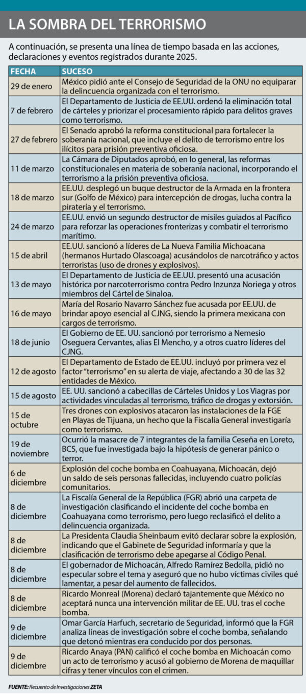 Esta postura se intensificó tras el decreto del presidente estadounidense Donald Trump, quien el 19 de febrero de 2025 designó a seis cárteles mexicanos de la droga (Cártel de Sinaloa, el Jalisco Nueva Generación, Cárteles Unidos, Cártel del Noreste, Cártel del Golfo y la Nueva Familia Michoacana) como organizaciones terroristas. Mientras la Federación se mantiene cautelosa, la presión estadounidense no cesa. El Departamento de Justicia de EE.UU. ordenó la eliminación total de cárteles, priorizando procesamientos rápidos para delitos graves como el terrorismo y crímenes capitales.