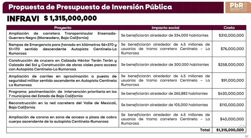 La contratación de financiamiento para hacer obras carreteras a cargo del Instituto de Infraestructura Vial de Baja California (INFRAVI) por 1,315 millones de pesos, derivado de la obligación que se obtuvo con el nuevo título de concesión de la carretera Mexicali-La Rumorosa, por 30 años.