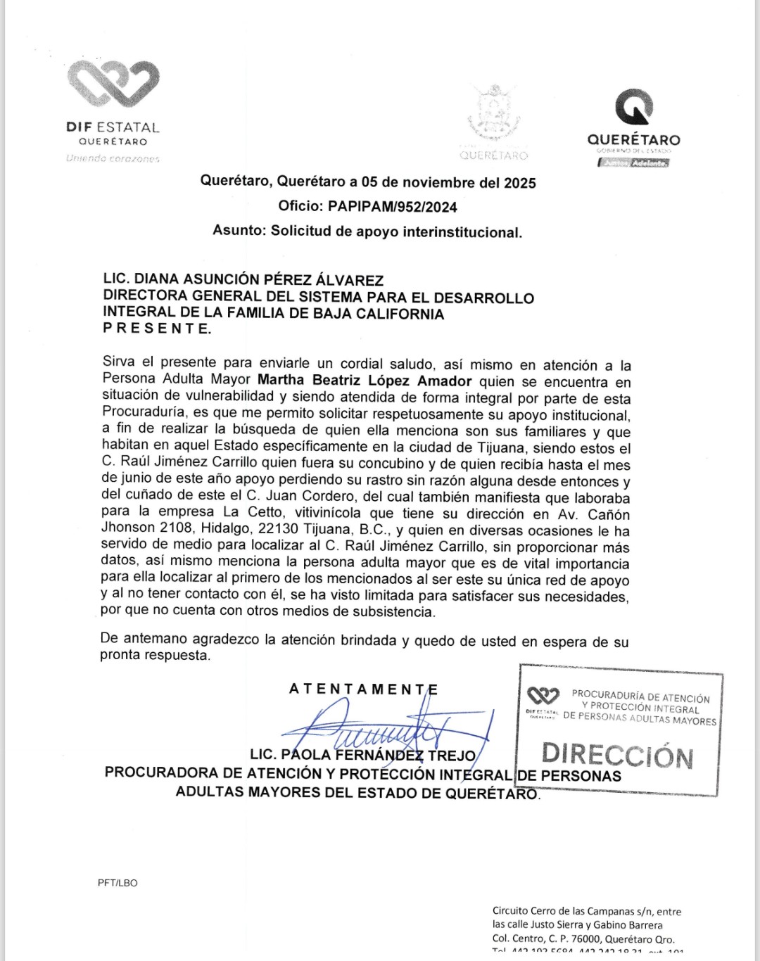 La que suscribe, Martha Beatriz López Amador, ante ustedes, con todo el debido respeto e infinitamente agradecida por las numerosas e inmerecidas atenciones que se sirvieron tener para conmigo durante mi estancia en la ciudad de Tijuana, al haberme hecho el favor de publicar mis escritos en la Sección Cartaz, con lo que me ayudaron más allá de lo que las palabras pueden expresar. No veo por qué en esta ocasión no actuarán de la misma forma noble y altruista publicando, a manera de un servicio social, el oficio adjunto signado por la Lic. Paola Fernández Trejo, procuradora de Atención y Protección Integral de Personas Adultas Mayores del Estado de Querétaro.
