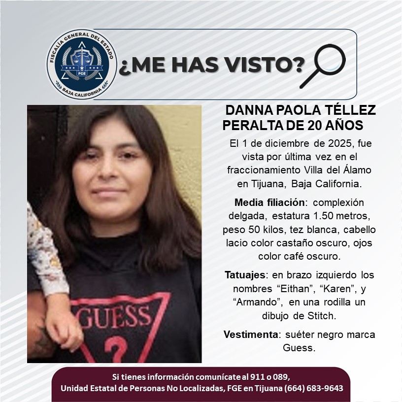 De acuerdo con información oficial, la detenida contaba con una ficha de búsqueda activa por parte de la Fiscalía General del Estado (FGE), emitida el pasado 1 de diciembre, luego de que se reportara su desaparición en el fraccionamiento Villa del Álamo, en Tijuana.