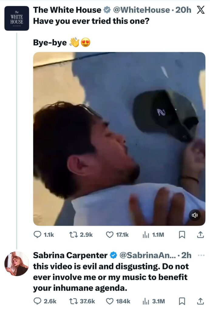A menos de 24 horas de la publicación, Carpenter emitió un contundente mensaje a través de X (antes Twitter): “Nunca me involucren a mí o a mi música para beneficiar su agenda inhumana”, reafirmando su rechazo total al uso político de su obra.
