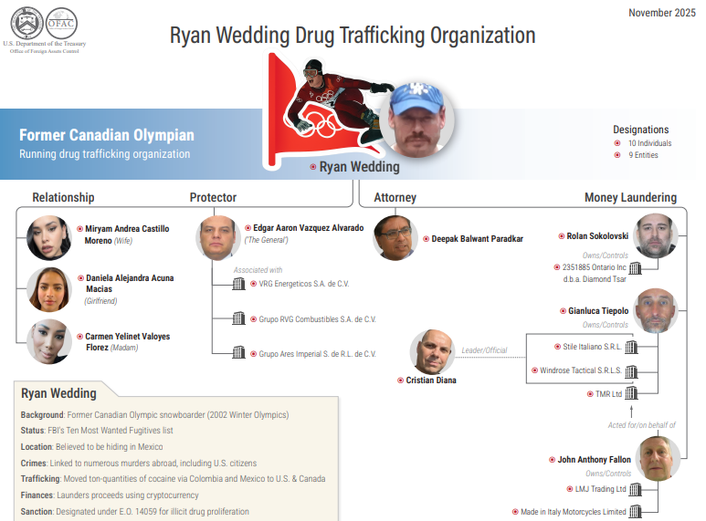 El snowboarder olímpico canadiense Ryan James Wedding fue arrestado el 23 de enero de 2026, según confirmó una fuente policial a CNN. Wedding figuraba entre los fugitivos más buscados por el Buró Federal de Investigaciones (FBI), que ofrecía una recompensa de 15 millones de dólares por información que condujera a su captura, debido a acusaciones de liderar una organización criminal internacional, involucrarse en el tráfico masivo de cocaína y ordenar múltiples asesinatos en una operación que abarcaba Estados Unidos, Canadá, México y Colombia.