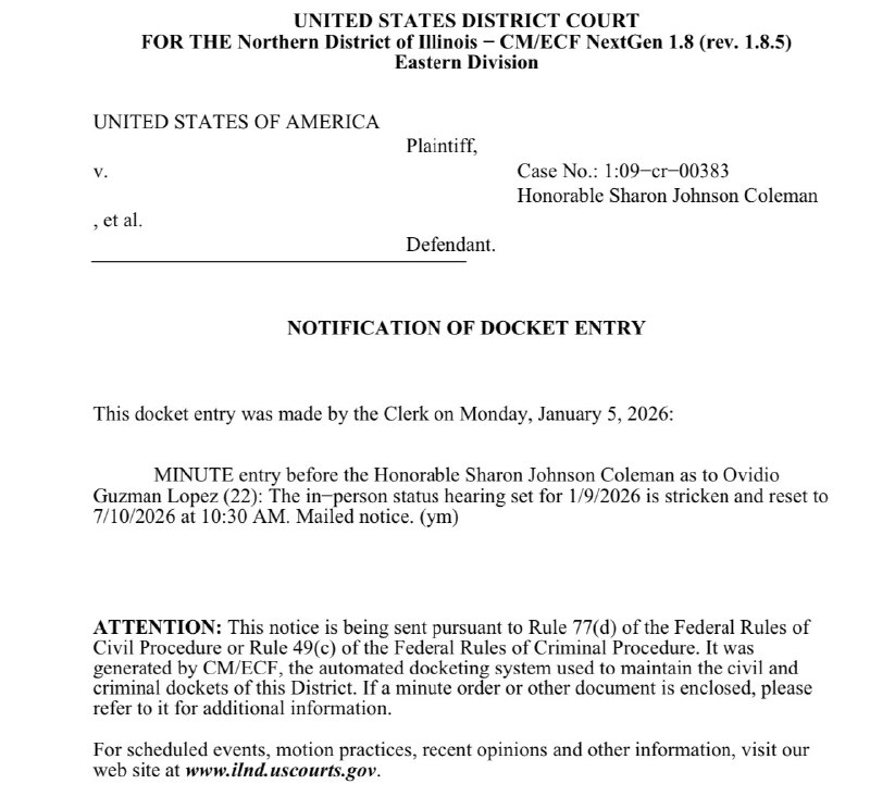 Según minutas actualizadas del tribunal federal, la comparecencia de Guzmán López del 9 de enero de 2026 estaba destinada a definir el calendario de su sentencia, luego de que el acusado se declaró culpable de cuatro cargos relacionados con tráfico de drogas, lavado de dinero y participación en una organización criminal vinculada al Cártel de Sinaloa. La jueza Sharon Johnson Coleman reprogramó dicha audiencia para el 10 de julio de 2026, sin que se detallaran públicamente los motivos específicos del ajuste de agenda en el expediente consultable.