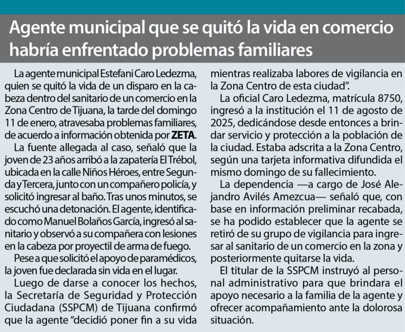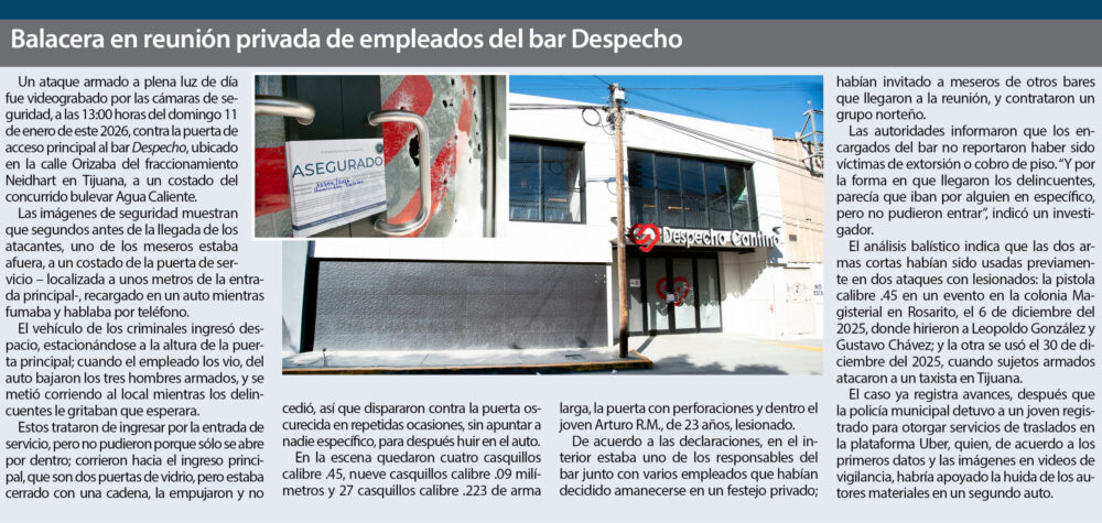 Uno de estos casos, se denunció a las 22:57 horas del día jueves 18 de diciembre de 2025, en el domicilio ubicado en la calle Oaxtepec de la colonia Colinas de Agua Caliente en Tijuana, cuando “mediante central de radio se informa reporte de personas armadas intentando entrar a un domicilio… al momento de arribar se observan daños en el portón eléctrico de color blanco”.