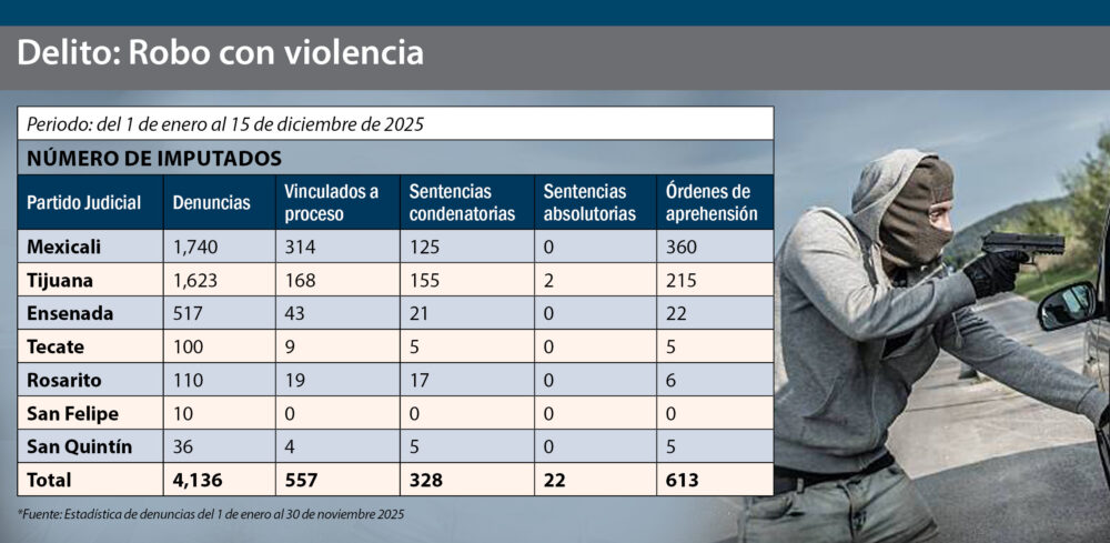 De acuerdo a las estadísticas oficiales, durante el año 2025, en Baja California, por cada 10 caso de robos violentos denunciados, sólo uno se resolvió con un presunto responsable detenido y sentenciado
