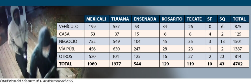 Contrario a lo que sucede con la mayoría de los delitos Tijuana, con mil 877 robos violentos, no ocupa el lugar uno, sino el segundo en el estado; el primero lo tiene Mexicali, con mil 980 carpetas, y también tiene la mayoría de las denuncias por robo a casa habitación, a negocios y otros.