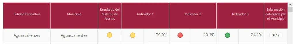 En el indicador uno del Sistema de Alertas, relativo a la deuda pública y vinculado a la sostenibilidad de la misma, Aguascalientes aparece en color amarillo (que sería nivel medio, es decir, lo califica como “endeudamiento en observación”). El indicador dos, que tiene que ver con la capacidad de pago, aparece en color rojo (que sería nivel alto y que supone un “endeudamiento elevado”).