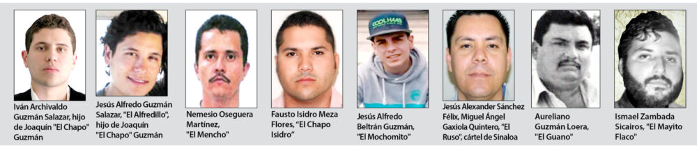Otros objetivos estadounidenses son Aureliano Guzmán Loera, el Guano, hermano del “Chapo” Guzmán, quien estaría operando junto a sus sobrinos Los Chapitos; su sobrino Jesús Alfredo Beltrán Guzmán, el Mochomito, hijo del narcotraficante Alfredo Beltrán Leyva, el Mochomo, condenado y preso en el país vecino del norte; Fausto Isidro Meza Flores, el Chapo Isidro, también líder de una de las células de los Beltrán Leyva; Ismael Zambada Sicairos, el Mayito Flaco, hijo de Ismael Zambada García, el Mayo, exlíder del Cártel de Sinaloa; y Juan José Ponce Félix, el Ruso, que opera para la misma facción en Sinaloa, Sonora y Baja California.