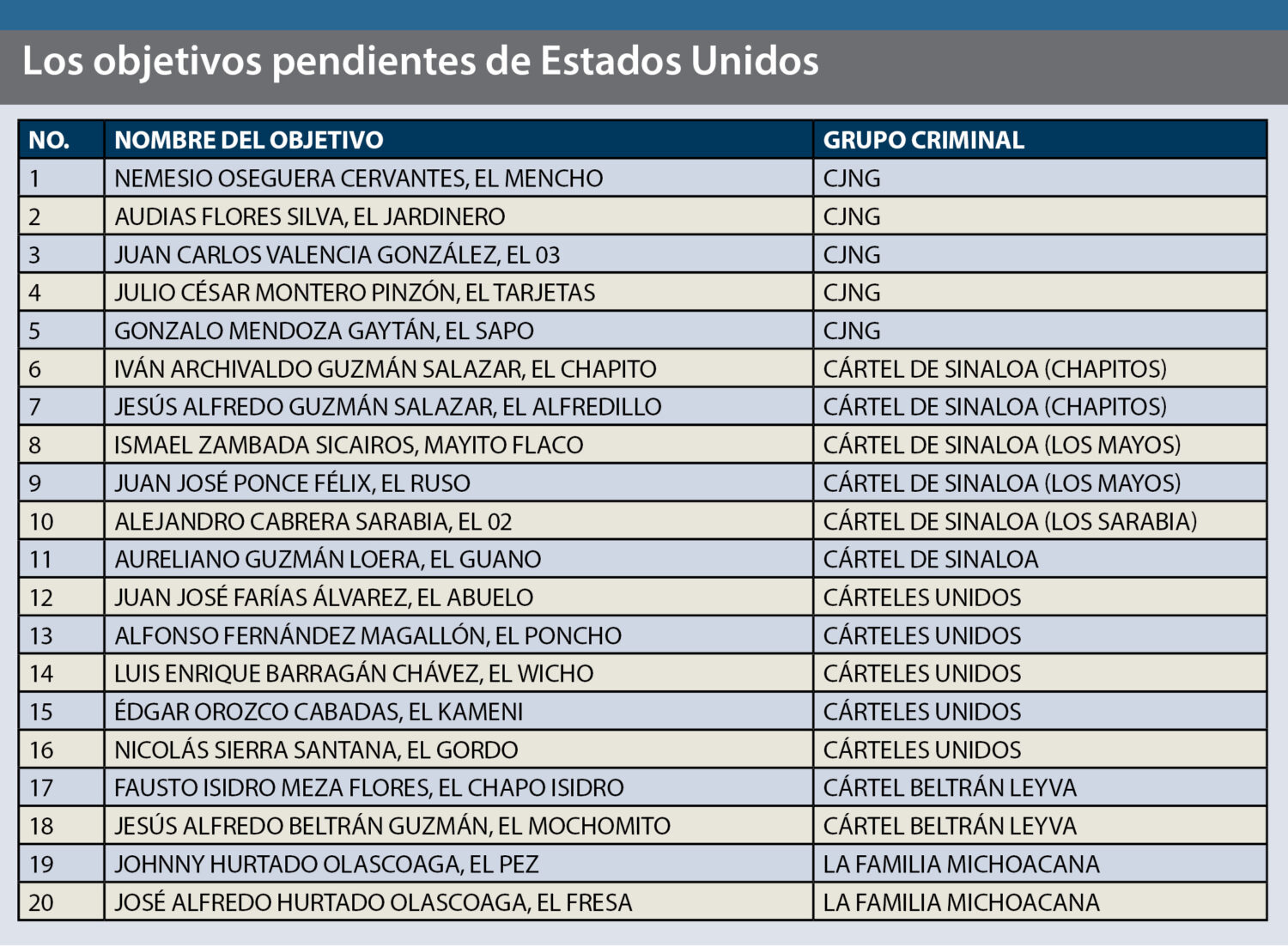 La lista la componen, entre los capos más relevantes, José Gerardo Álvarez Vásquez, el Indio; Pedro Inzunza Noriega, el Sagitario; María del Rosario Navarro Sánchez, la Chayo o la Señora (primera mexicana acusada de terrorismo); Juan Pedro Saldívar Farías, el Z-27 y/o el Orejón; Armando Gómez Núñez, Delta 1 y/o Máximo; José Luis Sánchez Valencia, Chalamán; Jair Francisco Patrón Tobías, el H4 y/o Crixus; Humberto Rivera Rivera, el Viejón o el Chato; Ricardo González Sauceda, Comandante Ricky; Heriberto Hernández Rodríguez, el Negrolo; Daniel Manera Macías, Danny; Julio César Mancera Dozal, la Tortuga; Daniel Alfredo Blanco Joo, el Cubano; Carlos Alberto Guerrero Mercado, el Químico; y Fidel Félix Ochoa, el Fido.