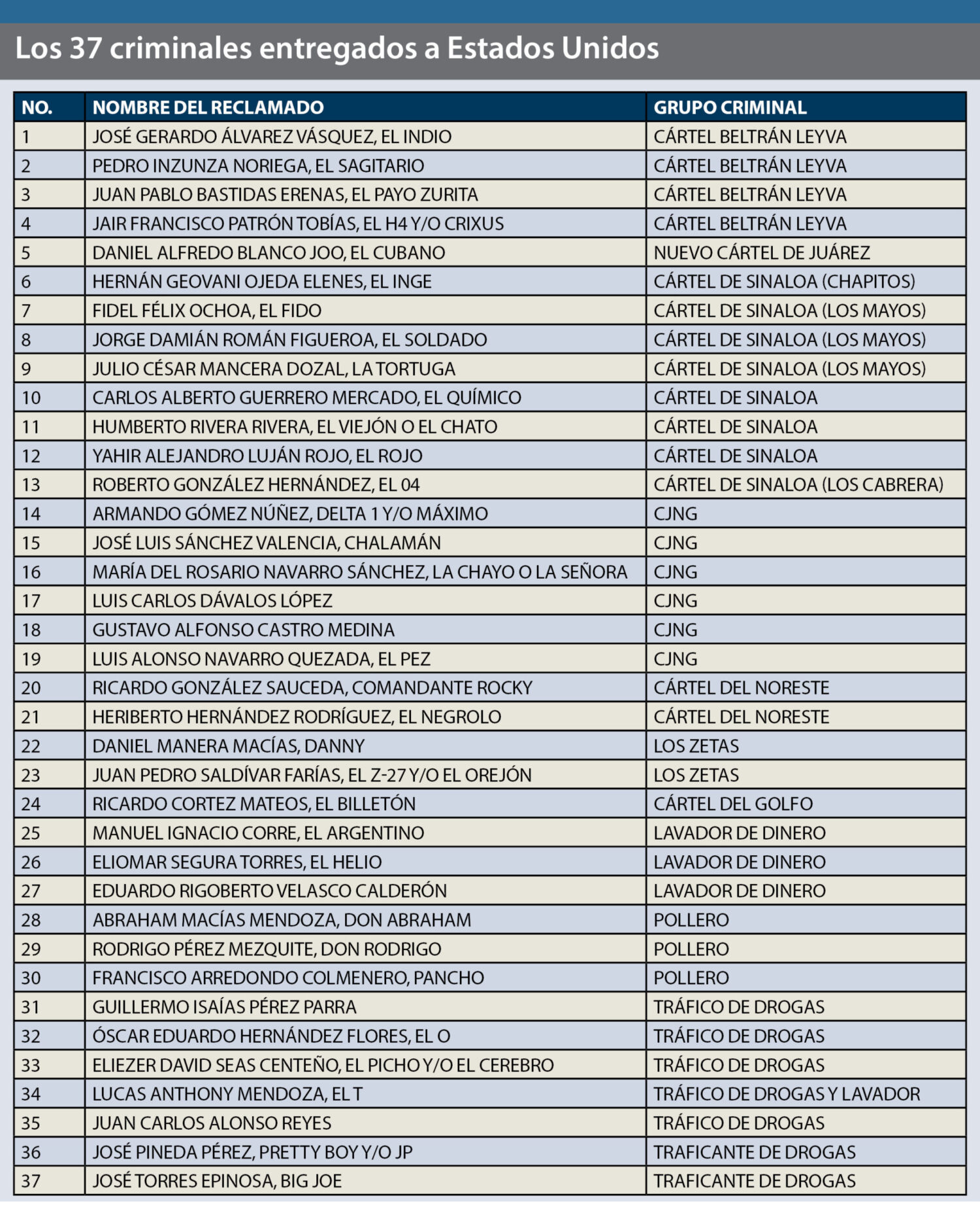 Otros de los entregados son Juan Pablo Bastidas Erenas, el Payo Zurita; Hernán Geovani Ojeda Elenes, el Inge; Jorge Damián Román Figueroa, el Soldado; Yahir Alejandro Luján Rojo, el Rojo; Roberto González Hernández, el 04; Luis Carlos Dávalos López; Gustavo Alfonso Castro Medina; Luis Alonso Navarro Quezada, el Pez; Ricardo Cortez Mateos, el Billetón; Manuel Ignacio Corre, el Argentino; Eliomar Segura Torres, el Helio; Eduardo Rigoberto Velasco Calderón; Abraham Macías Mendoza, Don Abraham; Rodrigo Pérez Mezquite, Don Rodrigo; Francisco Arredondo Colmenero, Pancho; Guillermo Isaías Pérez Parra; Óscar Eduardo Hernández Flores, el O; Eliezer David Seas Centeño, el Picho y/o el Cerebro; Lucas Anthony Mendoza, el T; Juan Carlos Alonso Reyes; José Pineda Pérez, Pretty Boy y/o JP; y José Torres Epinosa, Big Joe.
