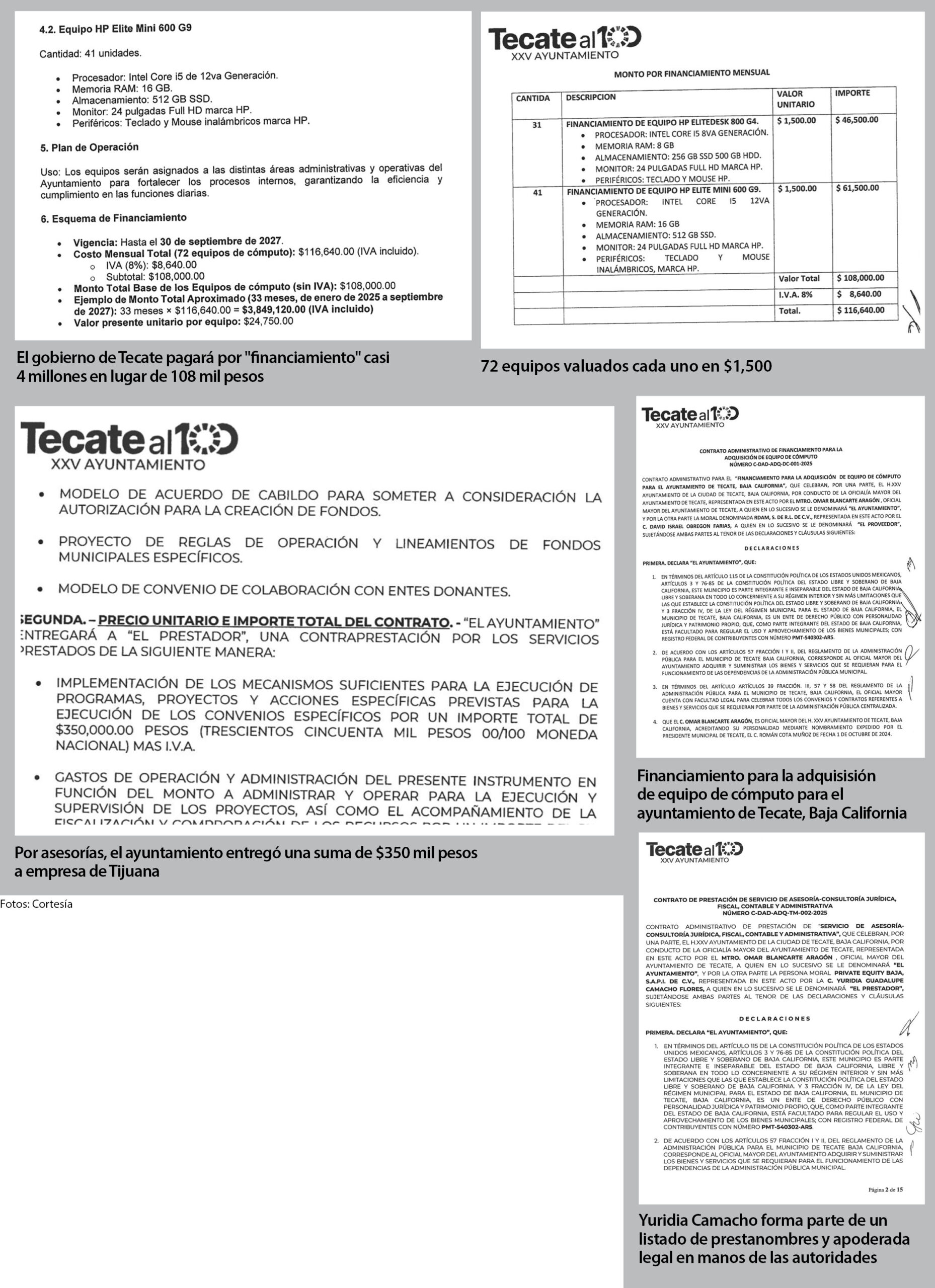 El 20 de enero del 2025, Omar Blancarte celebró un contrato de Financiamiento para la Adquisición de Equipo de Cómputo con la empresa denominada RDAM S. de R.L. de C.V., representada por David Israel Obregón, con dirección en Tijuana, a la que se le entregarían a lo largo de la administración, por el financiamiento de 72 equipos de cómputo con un valor unitario de mil 500 pesos cada uno, un pago total de siete millones 849 mil pesos; es decir de un precio total del pago de los 72 equipos de cómputo HP ELITE Y/O MINI (como se describen en el contrato), que resulta en 108 mil pesos, el Ayuntamiento de Tecate pagará por el llamado “refinanciamiento” más de 3.5 millones.