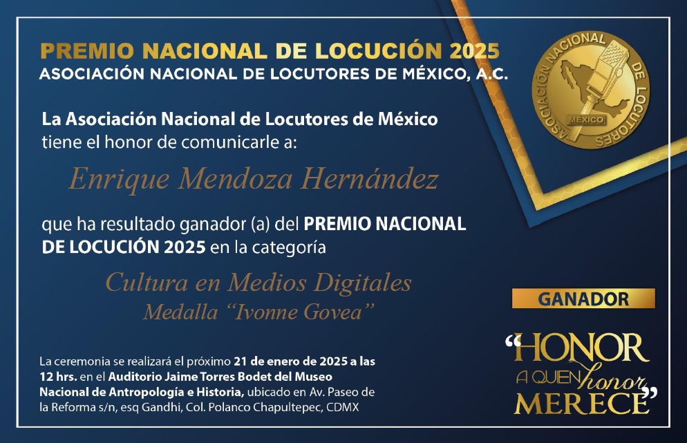 Enrique Mendoza Hernández, periodista cultural en Semanario ZETA, recibirá el Premio Nacional de Locución 2025 en la categoría de Cultura en Medios Digitales Medalla “Ivonne Govea”, informó este martes 13 de enero de 2026 la Asociación Nacional de Locutores de México, A. C.