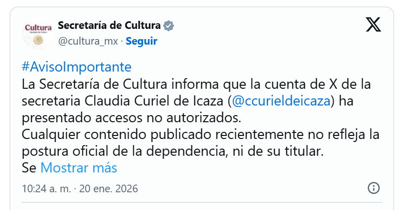 El 20 de enero de 2026, la cuenta de la red social X de la secretaria de Cultura Federal, Claudia Curiel de Icaza, fue vulnerada mediante accesos no autorizados y utilizada para difundir mensajes fraudulentos relacionados con un presunto token de criptomonedas.