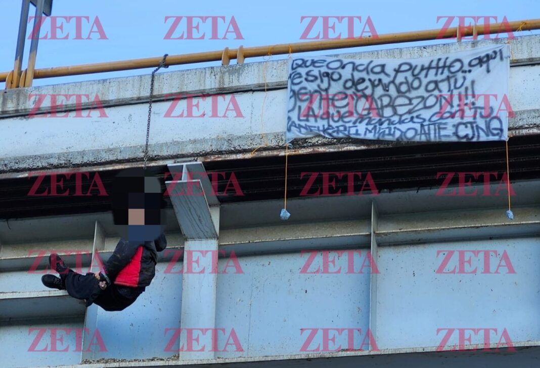 La mañana de este miércoles 14 de enero, fue localizado el cuerpo sin vida de un joven colgado de un puente en la zona de Valle de San Pedro, en Tijuana. Junto a la víctima, fue desplegada una manta con un mensaje de amenaza firmado con las siglas del CJNG.
