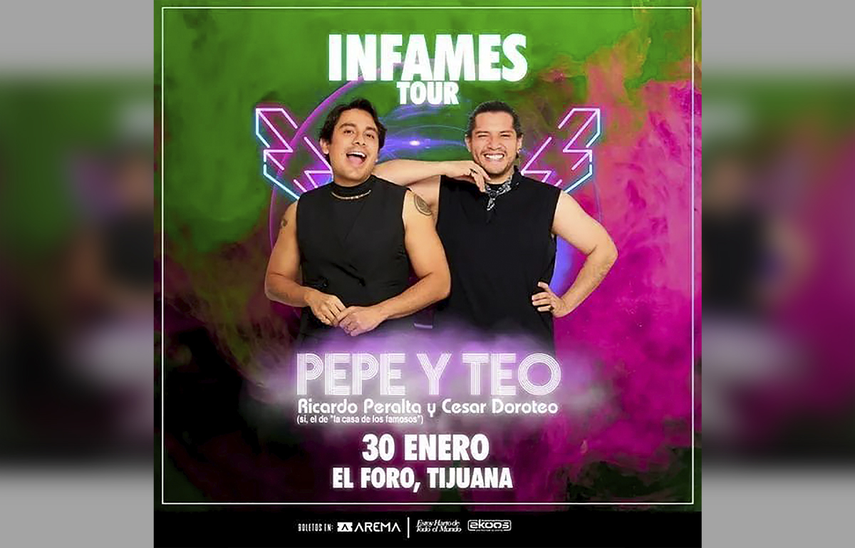 Los influencers Ricardo Peralta y César Doroteo, mejor conocidos como Pepe y Teo, se presentarán en Tijuana como parte de su gira “Infames”, hoy 30 de enero a las 9:00 p.m. en el Teatro Zaragoza.