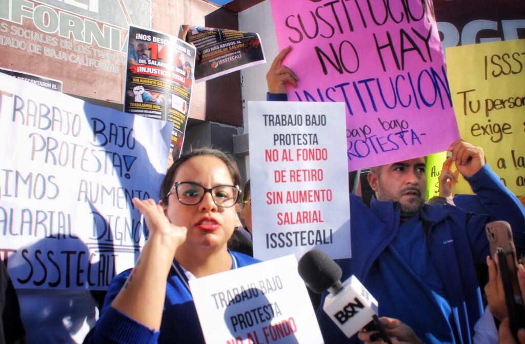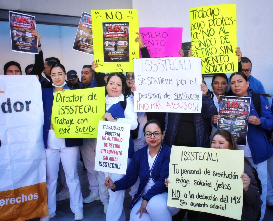 Este martes 27 de enero alrededor de 200 integrantes del personal de sustitución del Hospital de ISSSTECALI Mirador, ubicado en Tijuana, se manifestaron en contra del descuento del 14 por ciento que les realizaron en su salario el pasado viernes, para un supuesto fondo de pensión, pues acusan que en 10 años no lo han aumentado; así como por falta de basificación.