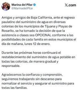 Ante los problemas que representa que no haya servicio de agua potable en los hogares y en los planteles educativos de Tijuana y de Playas de Rosarito, es por lo que la gobernadora anunció en sus redes sociales que el regreso a clases es opcional en Baja California, en las colonias que siguen afectadas por el corte del suministro de agua en la zona costa del Estado.