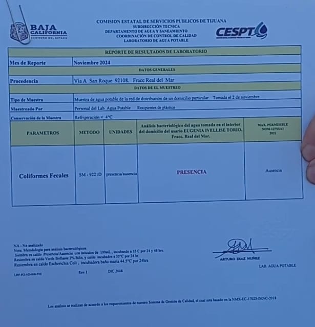 “Imagínate estarte bañando y que de repente te sale el agua con olor a popo, examinamos el agua en un laboratorio certificado y el resultado es el que les acaban de mostrar -presencia de coliformes en el agua de una vivienda-. Es un problema de salud muy serio, los certificados que salen de la Cespt y del laboratorio hablan por sí solos”, mencionó Mónica.