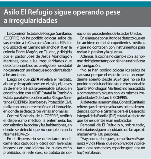 Este año, un denunciante anónimo refirió a este semanario que en el Centro de Rehabilitación El Oasis, ubicado en Cañón Jalisco No. 15 Colonia Guadalajara, en Tijuana, los encargados del lugar “prostituyen a las anexadas”. Aseguró que el establecimiento opera “sin permisos, ocultando drogas y (con) prostitución”.