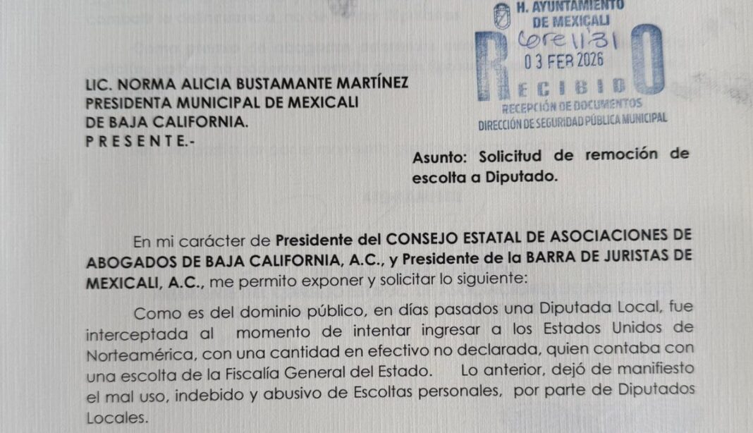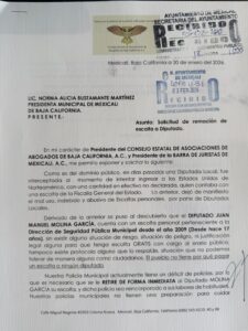 El presidente de dicha asociación, Elías Flores Gallegos, comentó que presentaron un oficio dirigido a la alcaldesa de Mexicali, Norma Bustamante Martínez, y a la propia Dirección de Seguridad Pública de la capital del estado para que se le retire de inmediato al legislador uno de los tres escoltas con los que cuenta, ya que este pertenece a la corporación municipal y su principal labor es proteger a la ciudadanía, más aún cuando Molina García no solventa su sueldo, sino las y los mexicalenses.