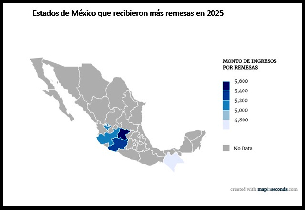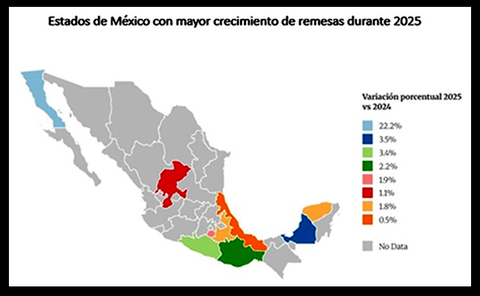 No obstante, la entidad representa cerca del 3% del total de las remesas enviadas a México, indicó Fuentes Contreras, quien consideró que el aumento podría estar asociado a las restricciones migratorias que inhibieron el cruce fronterizo de residentes. Situación semejante a la ocurrida en 2020, durante la pandemia de COVID-19, cuando se dio un alza de 29%, similar a la de 2025.