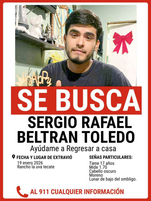 Sergio Beltran tenía 17 años, fue reportado como desaparecido por sus familiares el 21 de enero a través de redes sociales, visto por última vez en el Rancho de la Uva en el municipio de Tecate el 19 de enero del 2025. La búsqueda duró pocos días debido a que su cuerpo fue identificado por sus familiares por medio de redes sociales, cuando circularon imágenes de un decapitado localizado a las 7:41 horas del jueves 22 de enero sobre la carretera libre Tecate-Tijuana a la altura del km 30 en la colonia Paso del Águila.