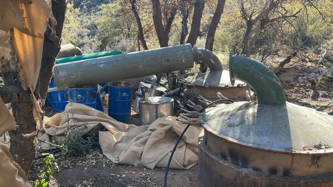 En el sitio fueron localizados bidones, tambos, tanques de gas, fosas sépticas, así como diversas sustancias y materiales químicos, relacionados de manera preliminar con la posible producción de enervantes. Las corporaciones aseguraron el lugar y establecieron un resguardo perimetral para proteger los indicios.