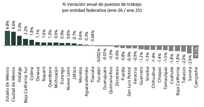 En enero de 2026, México tuvo una pérdida neta de 8 mil 104 puestos de trabajo afiliados al Instituto Mexicano del Seguro Social (IMSS); cifra que representó una baja de 0.9% respecto a enero del año pasado.