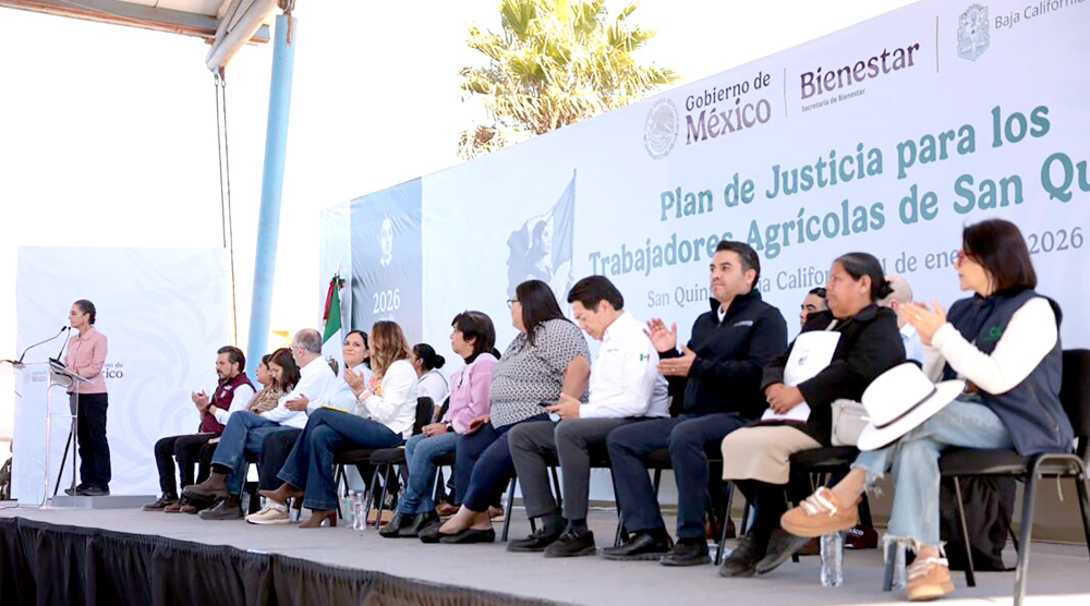 Ante cientos de asistentes en la Universidad Intercultural de Baja California, la Presidenta también anunció la instalación de un Centro de Justicia Laboral de la Secretaría del Trabajo y Previsión Social (STPS), así como un certificado que pretende garantizar la seguridad social para los jornaleros de las empresas exportadoras.