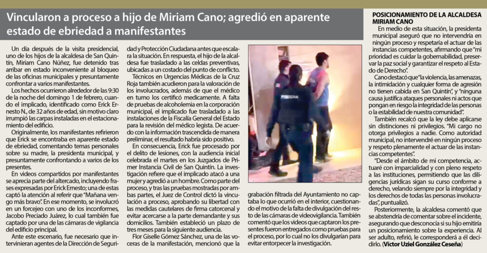 De hecho, durante su discurso en el sexto municipio, la Presidenta de la República le ordenó públicamente que se fuera a residir un tiempo a San Quintín para asegurarse que sus promesas sean cumplidas y coordinarse con el resto de las autoridades, incluida la alcaldesa, la polémica Miriam Cano. Pero nada. Desde el sábado 31 de enero de 2026 cuando Sheinbaum Pardo estuvo ahí, Carmen Antuna no ha regresado.