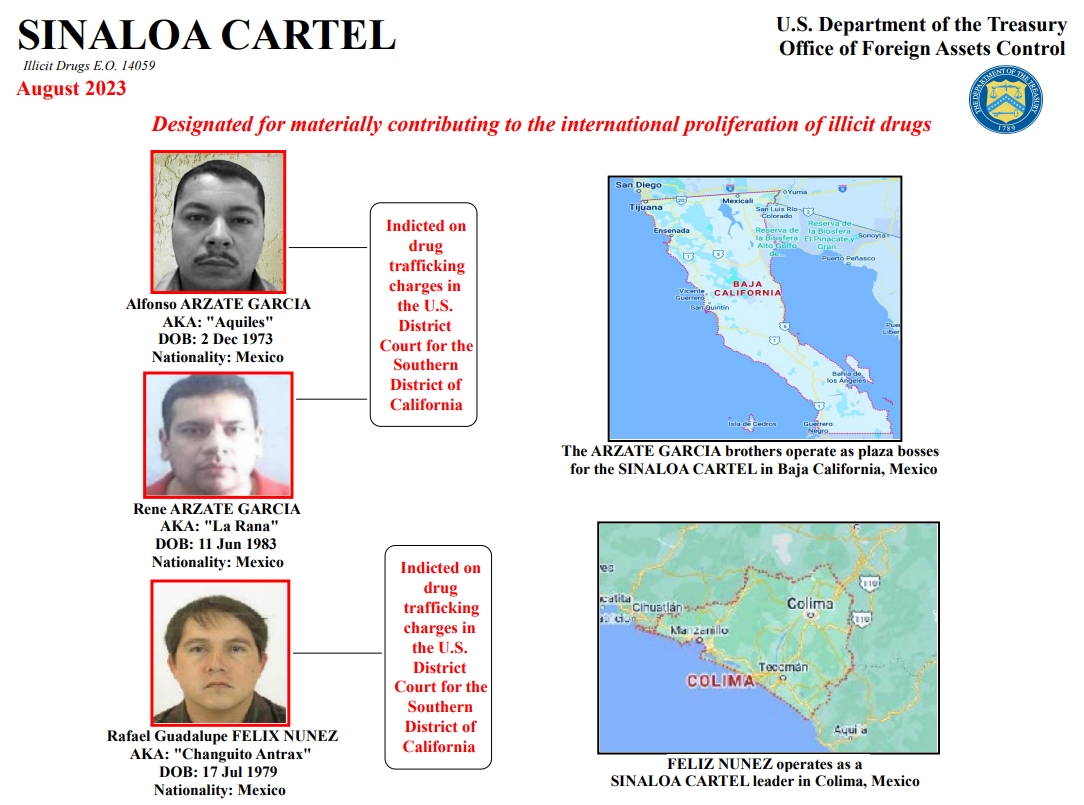 La Oficina de Control de Activos Extranjeros (OFAC, por sus siglas en inglés), del Departamento del Tesoro de Estados Unidos, designó, el 9 de agosto de 2023, a los hermanos Alfonso y René Zarate García, alias “El Aquiles” y “La Rana”, respectivamente, así como a Rafael Guadalupe Félix Núñez, a quienes calificó como tres miembros “notoriamente violentos” del Cártel de Sinaloa, involucrados en el tráfico ilícito de fentanilo y otras drogas.