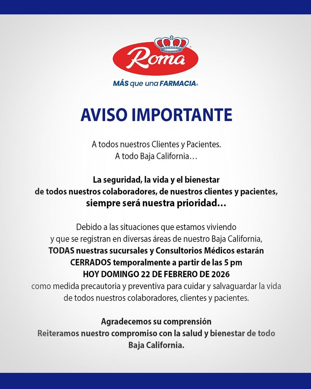 “Derivado de las situaciones que estamos viviendo y que se registran en diversas áreas de nuestro Baja California, todas nuestras sucursales y Consultorios Médicos estarán cerrados temporalmente a partir de las 5 pm hoy domingo 22 de febrero de 2026 como medida precautoria y preventiva para cuidar y salvaguardar la vida de todos nuestros colaboradores, clientes y pacientes”, dio a conocer Farmacias Roma.