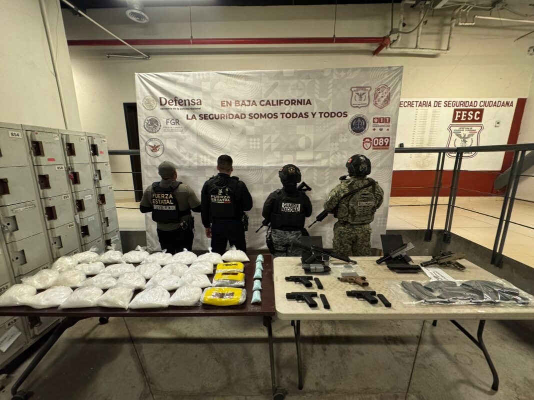 La noche del martes 10 de febrero, elementos de la Fuerza Estatal aseguraron un arsenal y drogas en un vehículo en la colonia Jardín Dorado en Tijuana.