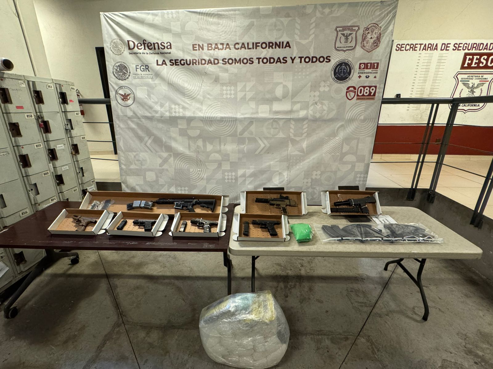 Al realizar la inspección se aseguró un fusil negro sin serie visible, equipado con cargadores que contenían 15 y 7 cartuchos respectivamente. En la misma bolsa se localizaron dos armas de fuego calibre .9 mm y cuatro armas de fuego cortas de calibre .40 y 9×19 mm, así como 08 cargadores para arma larga desabastecidos y una bolsa de plástico que contenía 210 cartuchos útiles de calibre 7.62×39 mm.
