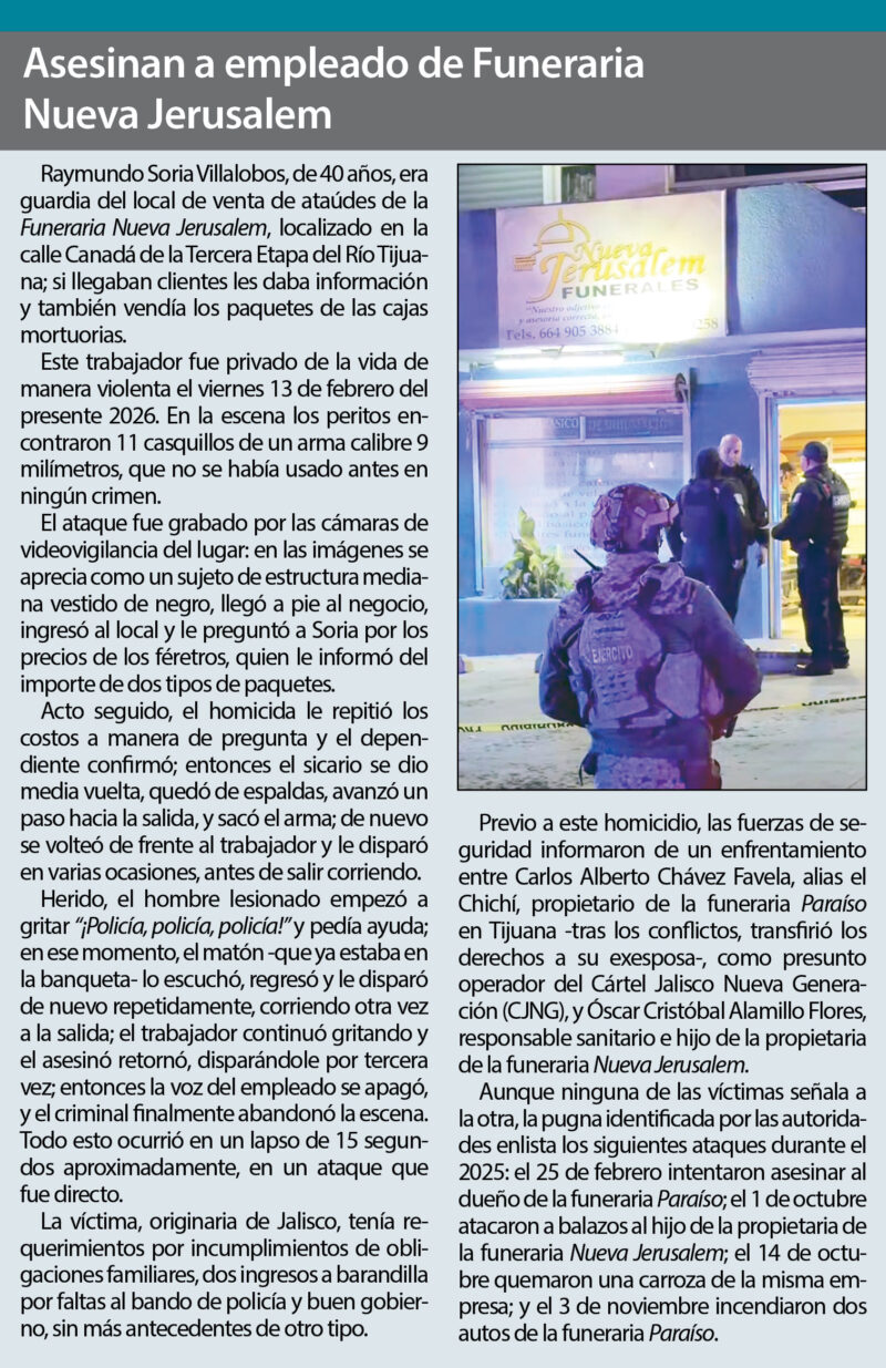 En aquel momento, la mujer victimada fue identificada por los grupos de inteligencia de las corporaciones en la Mesa de Coordinación por la Paz y Seguridad de Baja California como “una de las contadoras de Rafael de Jesús Sainz Villagomez, el 27, quien desde el último trimestre del año pasado había abandonado al Cártel de Sinaloa (CDS) y estaba operando con la protección de CJNG”.