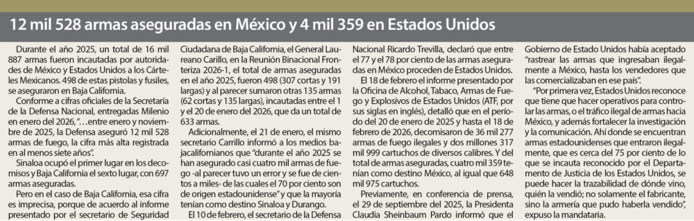 De las 135 armas aseguradas entre el 1 y el 26 de enero del 2026, un total de 121 eran del Cártel de Sinaloa, la mayoría localizadas en casas o autos abandonados, y sin detenidos.