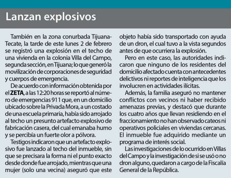 Adicionalmente, previo al ataque armado, en la zona conurbada de Tijuana y Tecate, dos hombres fueron ejecutados en las colonias Maclovio Herrera y Lázaro Cardenas, mientras que, horas después, otros dos más fueron acribillados en la colonia Loma Alta.