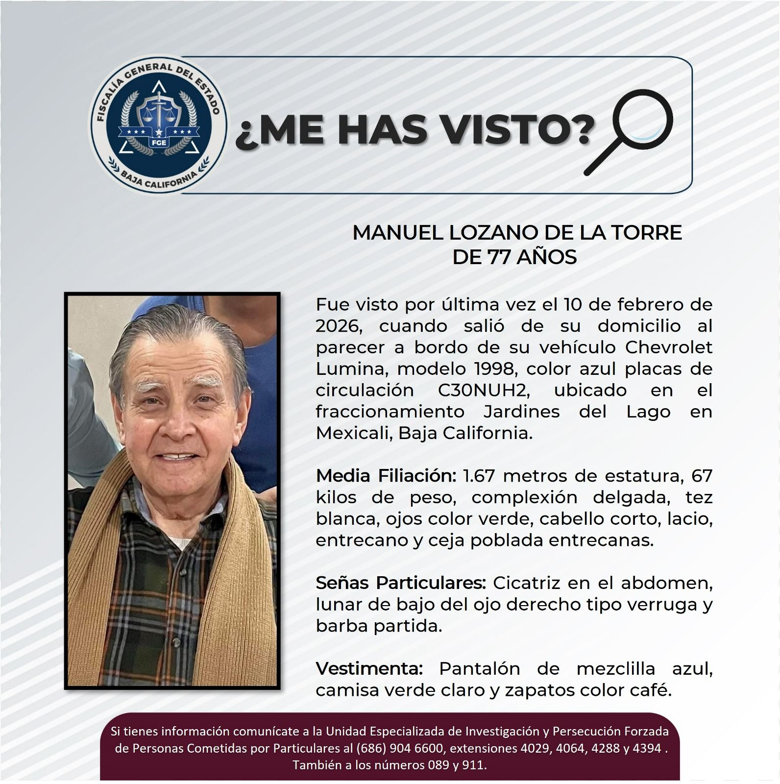 Fue desde el pasado martes que el señor Manuel Lozano de la Torre, de 77 años de edad, salió de su domicilio ubicado en el fraccionamiento Jardines del Lago, tomando su vehículo y retirándose del lugar, siendo la última vez que lo vieron con vida.