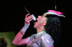 Apoyada por efectos sonoros cómicos y luces de colores, durante los primeros minutos del espectáculo, la comediante pidió botellas a las mesas cercanas al escenario, las cuales bebió mientras los asistentes coreaban “fondo, fondo”.