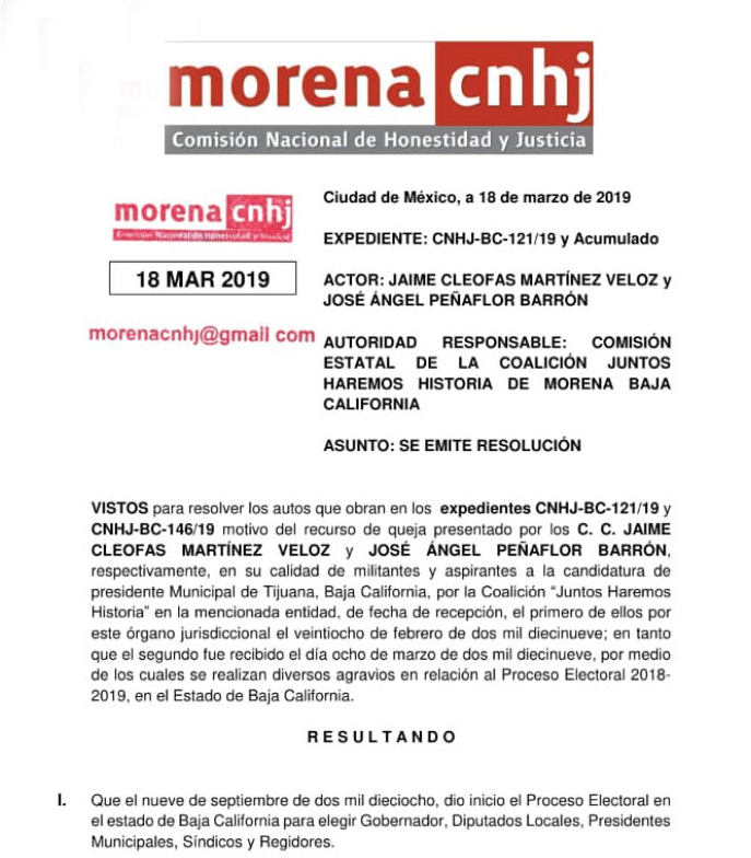 En marzo de 2019, la Comisión Nacional de Honestidad y Justicia de Morena resolvió que mi impugnación al proceso interno para elegir candidato a la Presidencia Municipal de Tijuana era fundada. El órgano partidista reconoció que el procedimiento había sido manipulado, opaco y violatorio de los principios más elementales de certeza y legalidad.