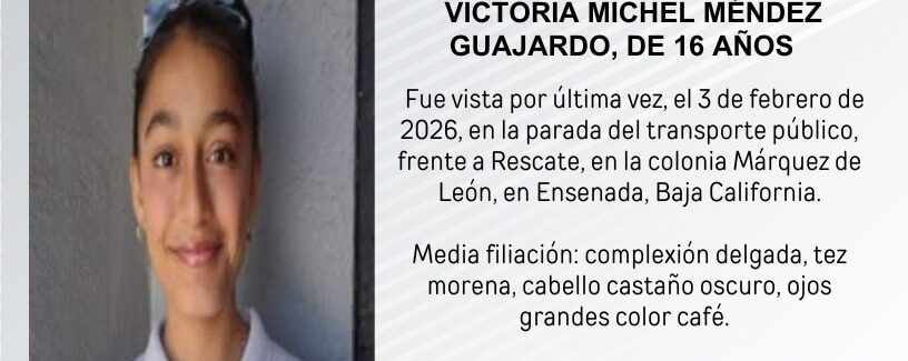 La Fiscalía General del Estado solicita la colaboración de la comunidad para localizar a Victoria Michel Méndez Guajardo, de 16 años. Fue vista por última vez, el 3 de febrero de 2026, en la parada del transporte público, frente a Rescate, en la colonia Márquez de León, en Ensenada, Baja California.