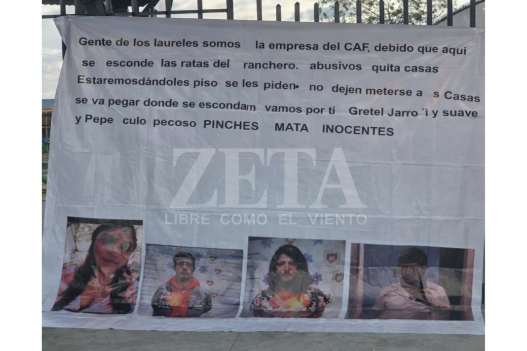 Uno de los reportantes indicó que la manta medía aproximadamente 2.5 metros de largo y contenía los rostros de varias personas. Otro denunciante señaló que el mensaje, escrito en tinta negra, incluía amenazas dirigidas a “personas dedicadas a quitar terrenos”.