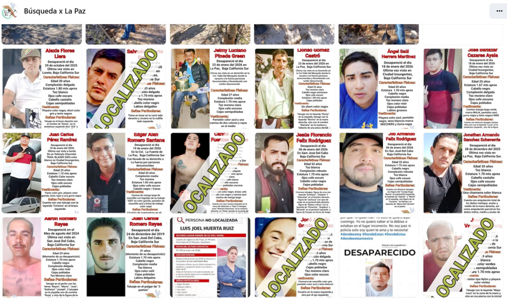 De acuerdo al Registro Nacional de Personas Desaparecidas y No Localizadas, del primero de enero del 2024 a los primeros días de febrero del 2026; en el municipio de Los Cabos se han reportado 467 personas desaparecidas o no localizadas; en La Paz son 489; van 80 en Comondú; 55 en Mulegé; y un total de 30 en Loreto. Además de dos personas sin municipio registrado o se desconoce.